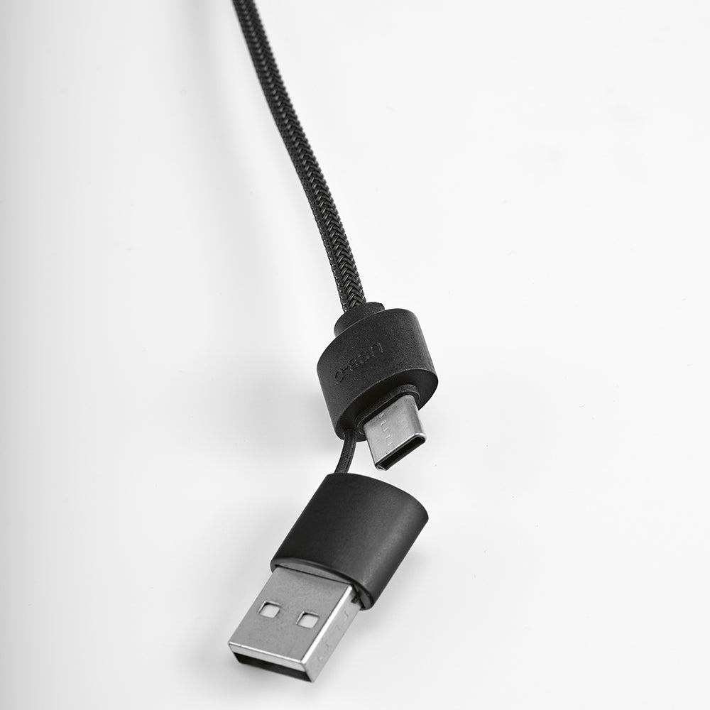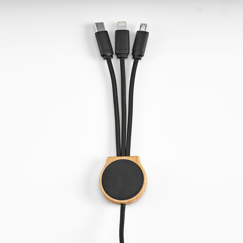 5-u-1 brzi punjač izrađen od rPET materijala i bambusa. Ovaj inovativni višenamjenski kabel za brzo punjenje (5V/2.4A) sadrži priključke za USB-A, USB-C, Micro-USB i Lightning, što ga čini svestranim dodatkom za svakodnevnu upotrebu. Logo postaje osvijetljen nakon personalizacije. Pakiran u pojedinačnoj kraft vrećici.