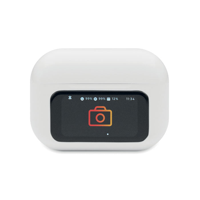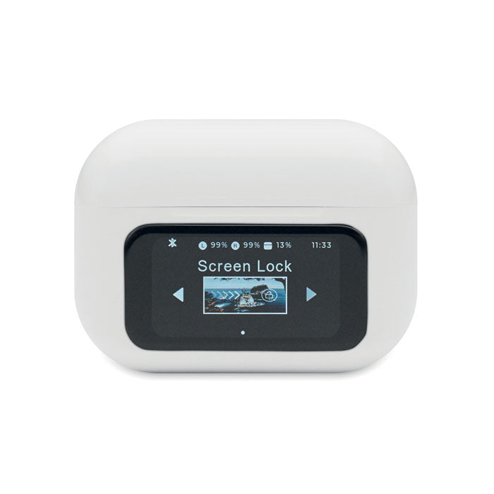 Reklamne ABS 5.0 bežične stereo slušalice 30 mAh s ANC/ENC i mikrofonom te bazom za punjenje od 230 mAh. Upravljanje i prikaz putem zaslona osjetljivog na dodir.