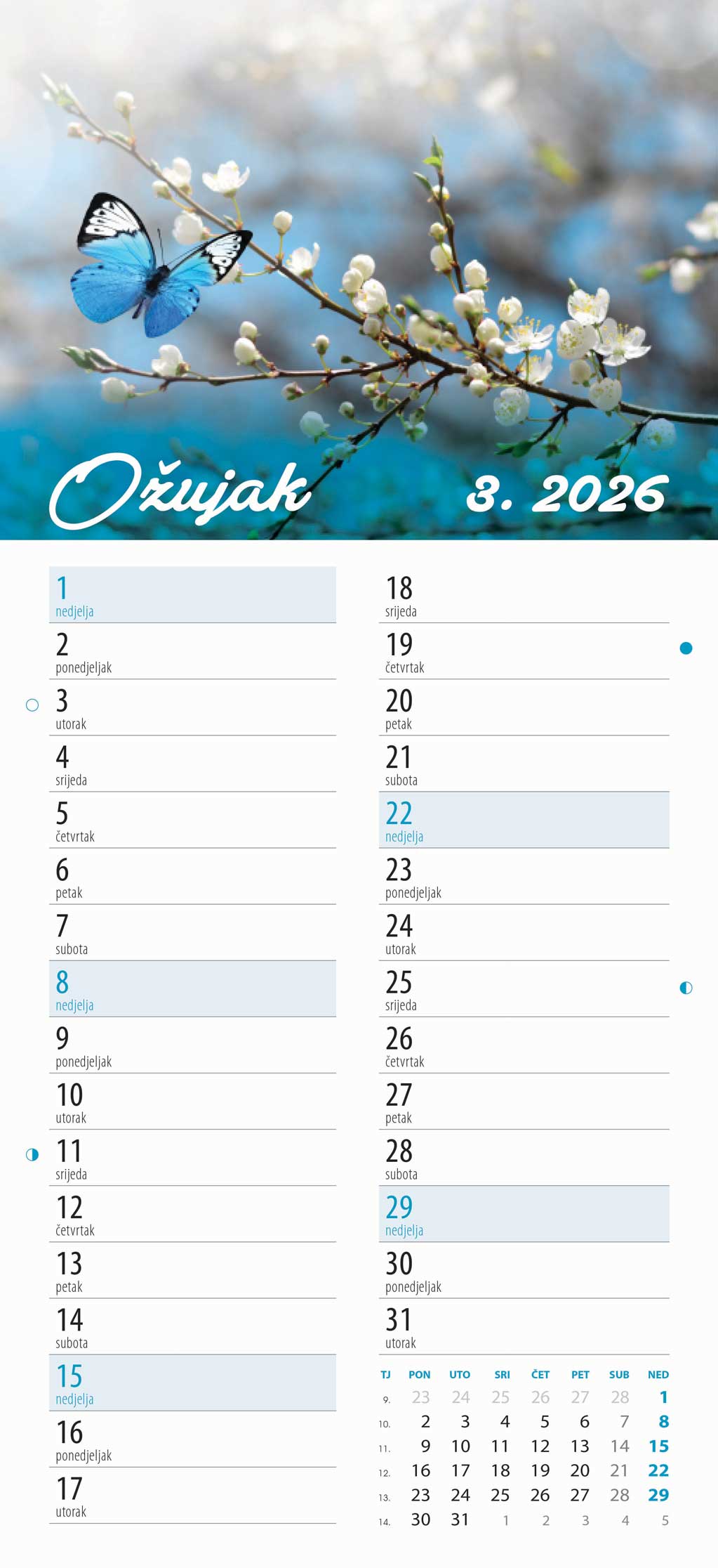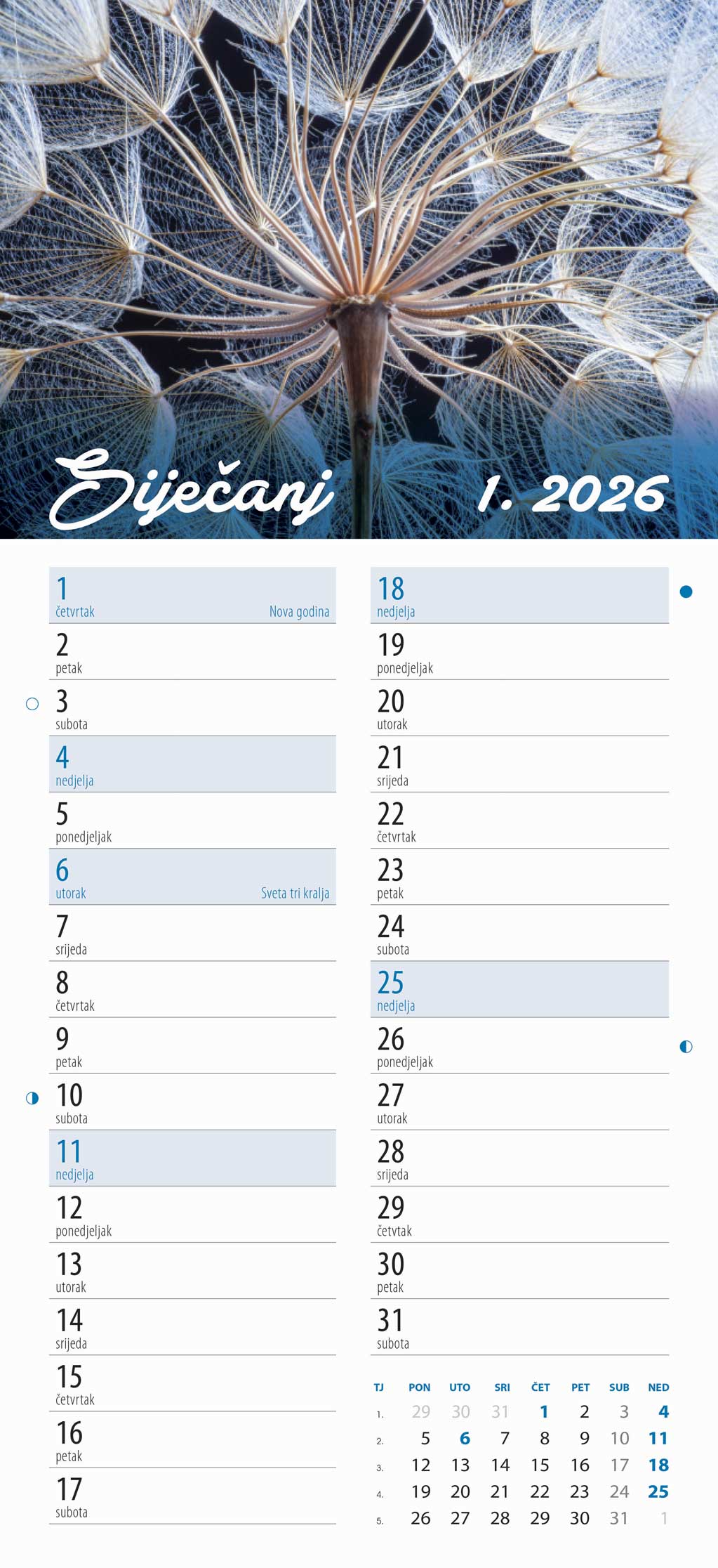 Promotivni zidni kalendar Cvjetni planer, s naslovnicom + 12 listova sa slikama cvijeća i planerom. S jednomjesečnim kalendarijem i vrećicom.
