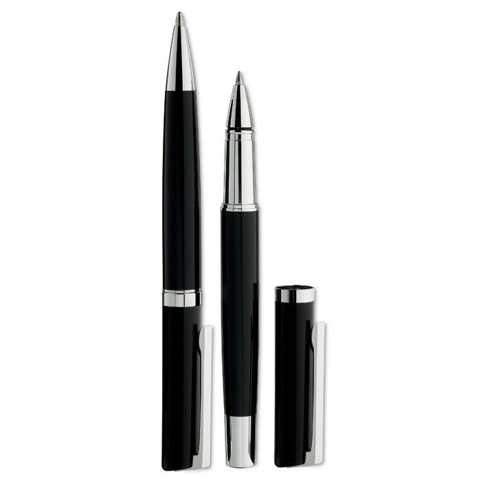 Promotivni set koji uključuje kemijsku olovku s mehanizmom na okretanje i roler olovku, obje s plavom tintom. Set dolazi u elegantnoj poklon kutiji, savršen za poslovne darove, školu ili svakodnevnu upotrebu.